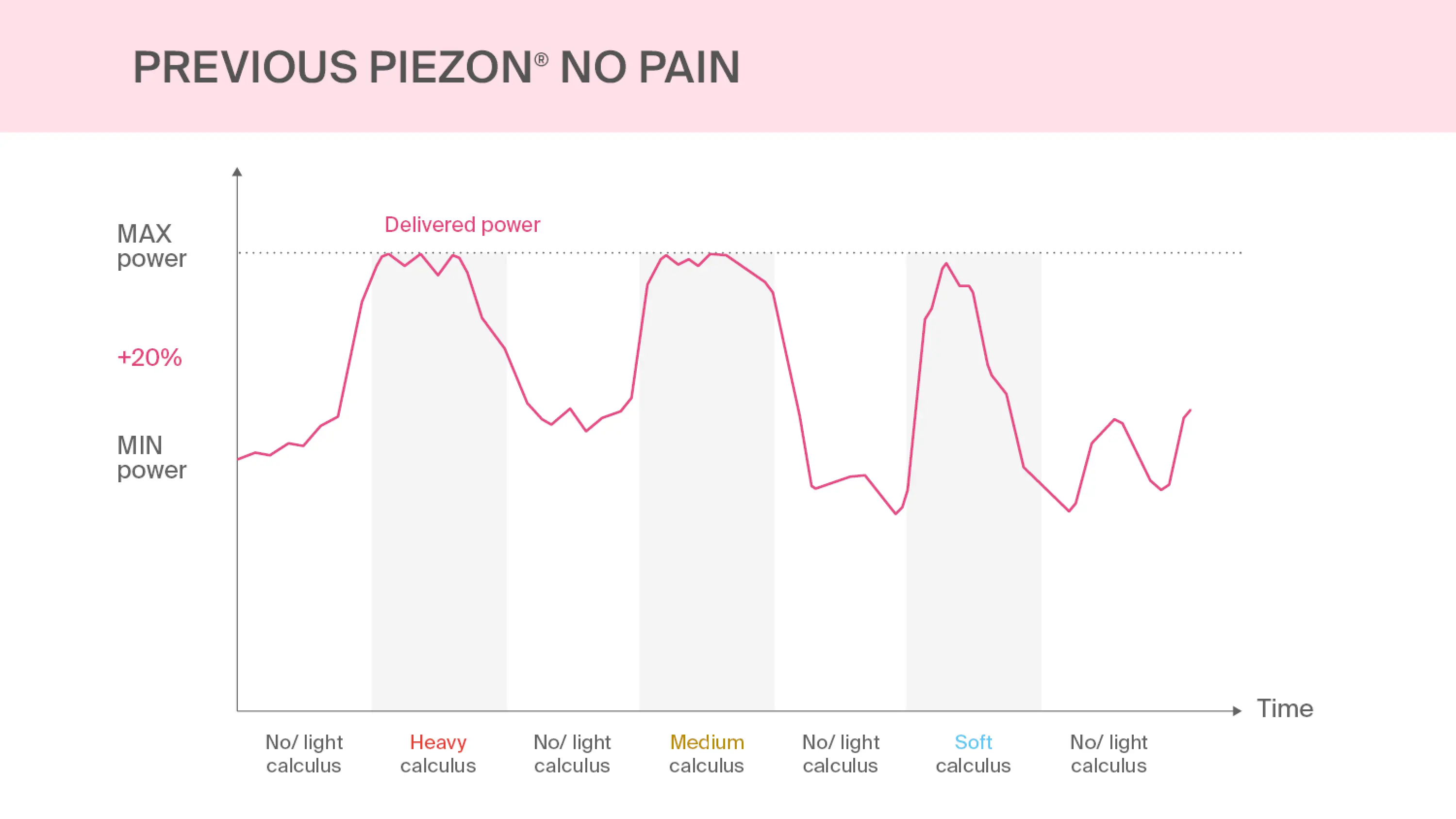A PIEZON® NO PAIN¹ MAX modul automatikusan beállítja a készülék teljesítményét a fogkő típusának megfelelően. Ahelyett, hogy mindig a maximális előre beállított teljesítményt használná, a rendszer dinamikusan növeli vagy csökkenti