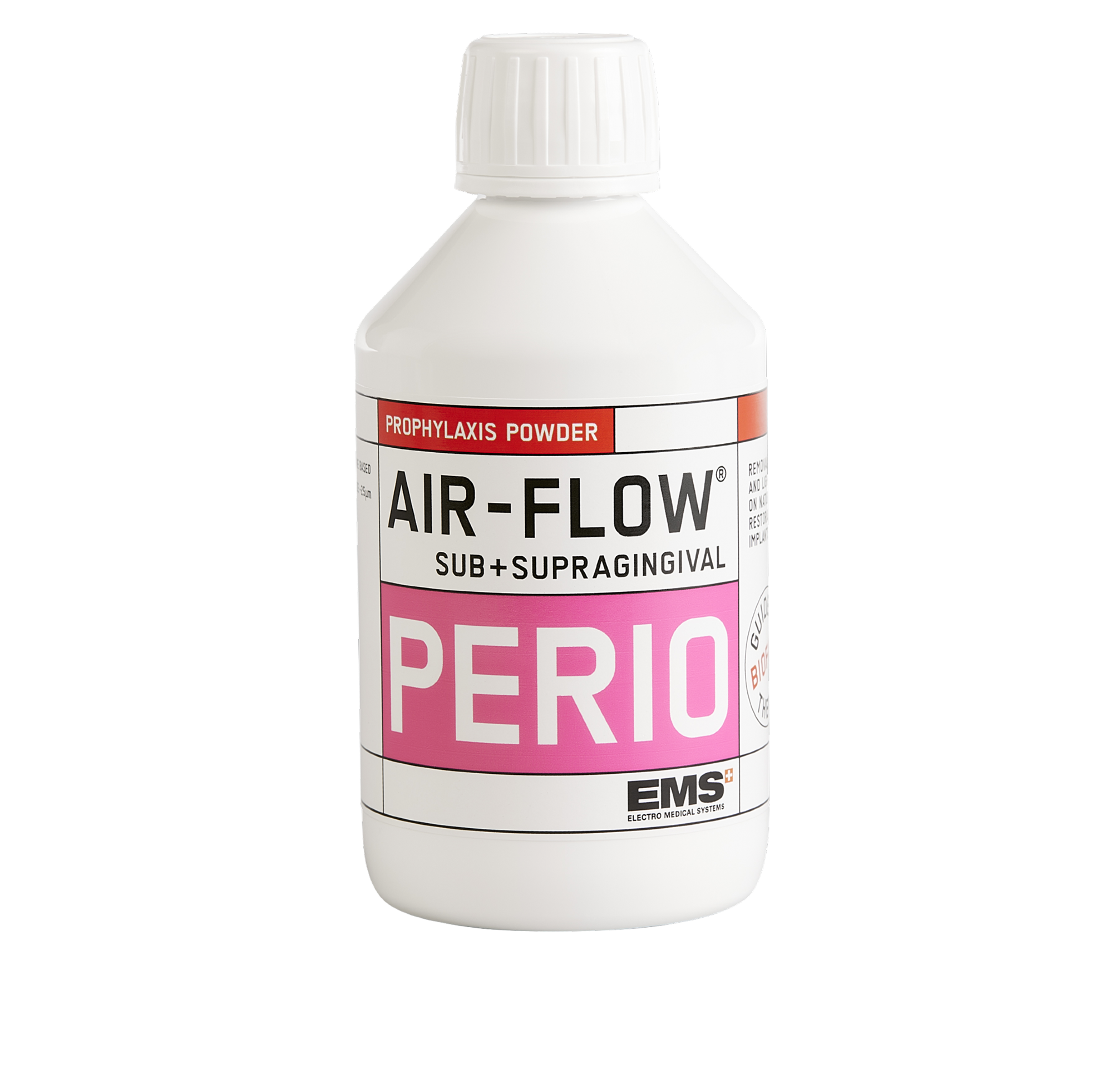 EMS AIRFLOW® PERIO è una polvere per profilassi a base di glicina specificamente formulata per la rimozione del biofilm sia sopragengivale che sottogengivale. La sua fine granulometria di circa 25 µm e il basso peso specifico la rendono delicata sui tessuti molli, sulle gengive, sulle aree palatali e sulle superfici dei denti naturali e degli impianti. Questa polvere è particolarmente efficace nella gestione del biofilm parodontale e perimplantare.