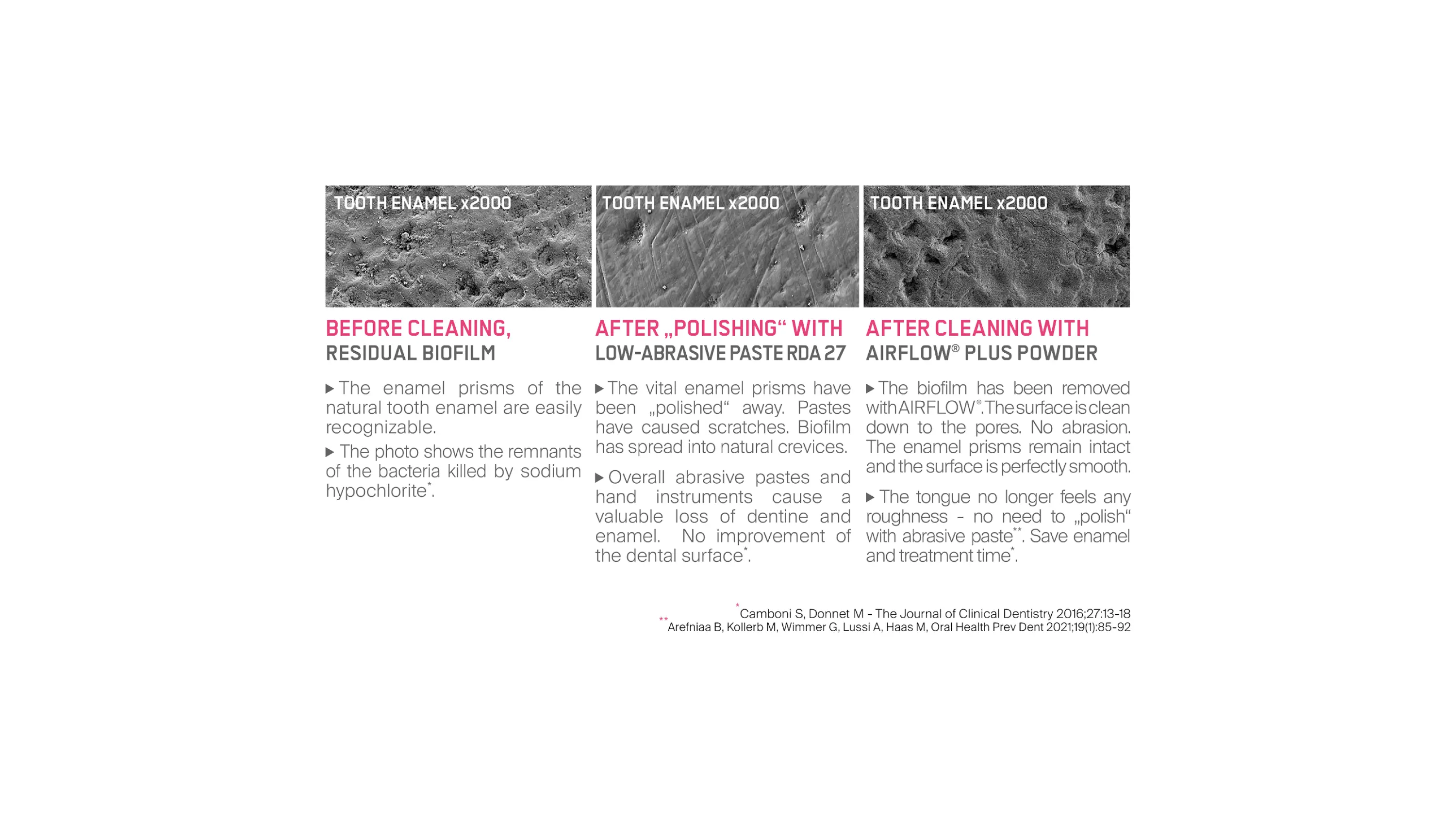 ¹ Arefnia B, et al.: Oral Health Prev Dent 2021; 19(1): 85-92²Camboni S, Donnet M: The Journal of Clinical Dentistry; 2016; 27(1): 13-18³Badersten A. et al.: J Clin Periodontol 1981; 8: 57-72⁴Reinhart D. et al.: PLOS ONE 2022; 17(7): e0270938. doi: 10.1371/ journal.pone.0270938⁵Burkhardt A. et al.: Effect of air-polishing using erythritol on surface roughness of enamel and dentine compared to conventional methods, Poster EuroPerio, Copenhagen 15-18 June 2022 Superscript Fortmeier S. et al: Effect of professional cleaning procedures on tissue loss in dentine and enamel – an ex-vivo study, Poster EuroPerio, Copenhagen 15-18 June.Soft return