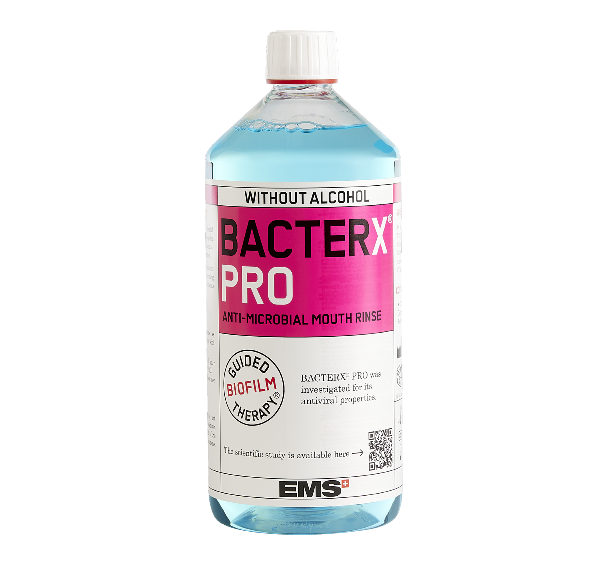 BacterX® Pro è un collutorio professionale progettato per l'uso negli studi dentistici. Viene utilizzato per ridurre batteri e virus vitali prima del trattamento.