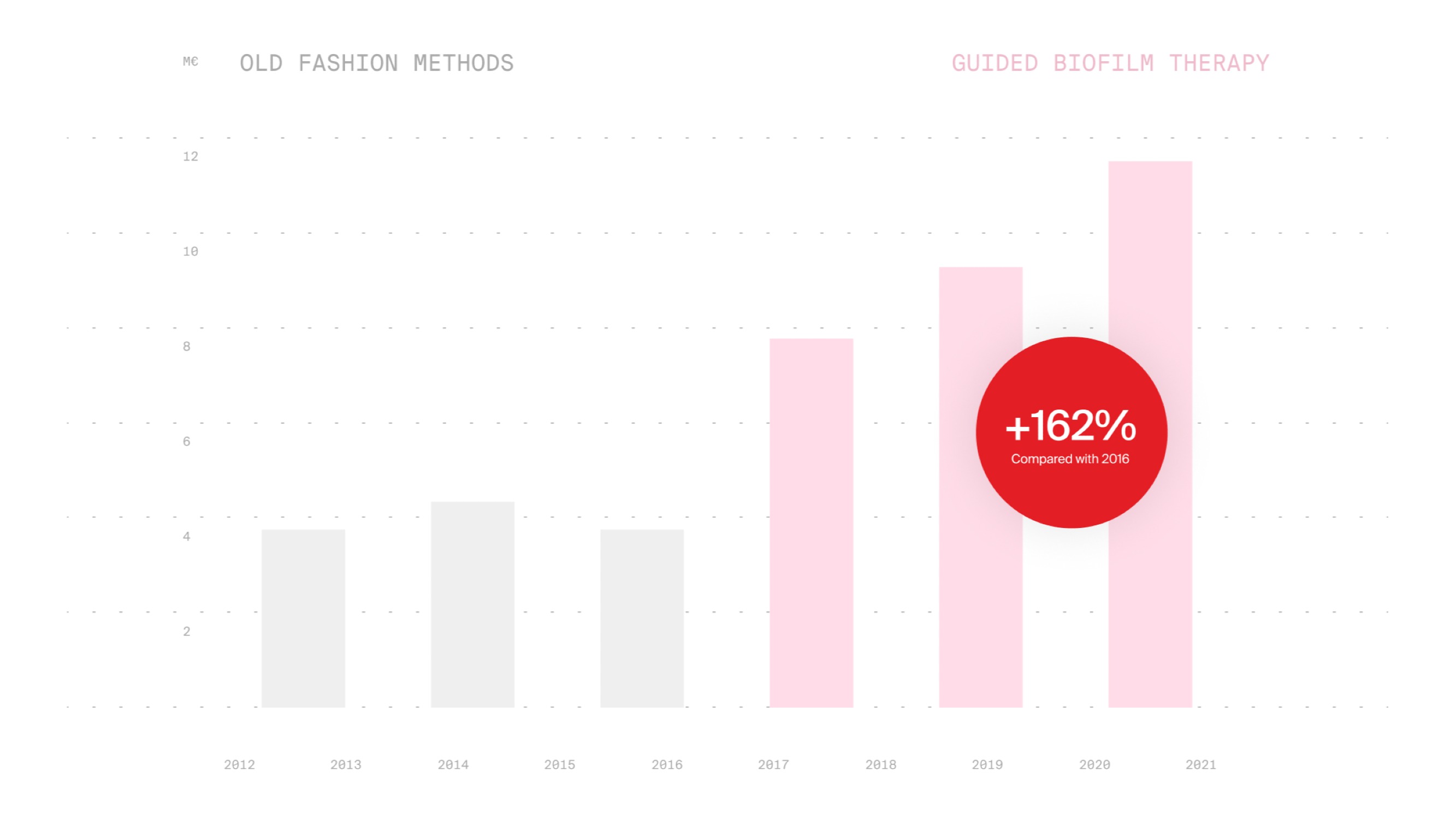 Dando priorità alle cure ricorrenti dei pazienti, non solo si migliora la fidelizzazione, ma si riducono anche in modo significativo i costi legati all'acquisizione di nuovi pazienti. È più facile e più conveniente mantenere il coinvolgimento dei pazienti esistenti piuttosto che cercare costantemente nuovi pazienti. Prendiamo ad esempio un DSO con 24 cliniche che ha introdotto GBT nel 2017: dall'implementazione, ha più che raddoppiato i propri ricavi, ottenendo un notevole aumento del fatturato pari al +162%.